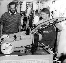 natürlich noch eine Bandschleif-maschine – Steinschliff für Snowboards war noch unbekannt. Die ersten Sporthändler aus dem Raum Düsseldorf und Krefeld lassen ihren Service beim Spezialisten Nabben